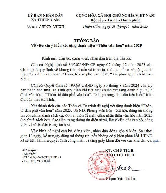 Thông báo về xin ý kiến xét tặng danh hiệu "Thôn Văn hóa" năm 2025Phòng VH-XH28/10/2025A -A+Phòng VH-XH28/10/2025A -A+Ủy ban nhân xã Thiên Cầm ban hành thông báo về việc xét tặng danh hiệu "Thôn Văn hóa" năm 2025 File đính kèm892 thong-bao-xin-y-kien-dong-gop-binh-xet-danh-hieu-van-hoa-nam-2025-1-(28.10.2025_11h08p46)_signed.pdf