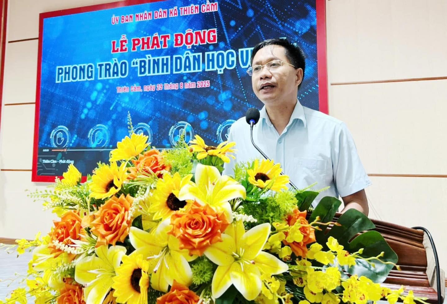 Chiều ngày 23/8/2025 UBND xã Thiên Cầm, tỉnh Hà Tĩnh tổ chức Lễ phát động “phong trào bình dân học vụ số” gắn với “ Học tập số” và Hội nghị tập huấn công tác chuyển đổi số. Dự lễ phát động có đồng chí Nguyễn Thanh Lâm – Phó giám đốc Trung tâm KH-CN, Sở Khoa học – Công nghệ, đại diện chuyên viên phòng chuyển đổi số Sở KH-CN. Ở xã có đồng chí Nguyễn Bá Đức – Bí thư Đảng ủy, Chủ tịch HĐND xã, đồng chí Từ Tuấn Phương – Phó Bí thư Thường trực Đảng ủy xã, đồng chí Võ Tá Nhân – Phó Bí thư Đảng ủy, Chủ tịch UBND xã và các đồng chí trong Ban thường vụ Đảng ủy; thường trực HĐND, lãnh đạo UBND, Ban Thường trực UBMTTQ Việt Nam xã; đại diện lãnh đạo ban xây dựng Đảng, UBKT, BCH Công an, Quân sự, các ban HĐND; các đồng chí trưởng, phó phòng chuyên môn, Trung tâm Phục vụ hành chính công, Ban Giám hiệu các trường học, trưởng trạm Y tế, các đồng chí Bí thư chi bộ, Thôn trưởng, thành viên tổ chuyển đổi số cộng đồng các thôn.